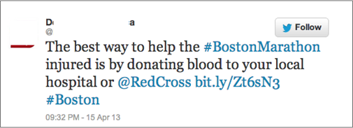 Various calls for blood donations after the Boston Marathon Bombing, for example